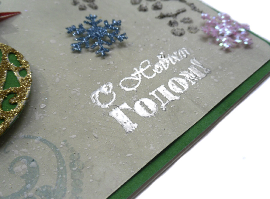 В работе использовала вырубку, блёстки, бантик из ленточки, колокольчик, бумагу, структурную пасту гранит, штамп.